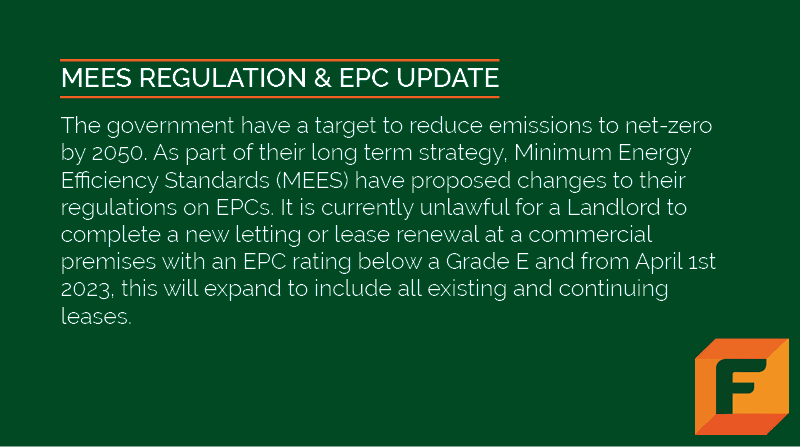 Under the current MEES regulations, it is unlawful for a Landlord to complete a new letting or lease renewal at commercial premises with an Energy Performance Certificate (EPC) below a Grade E.
