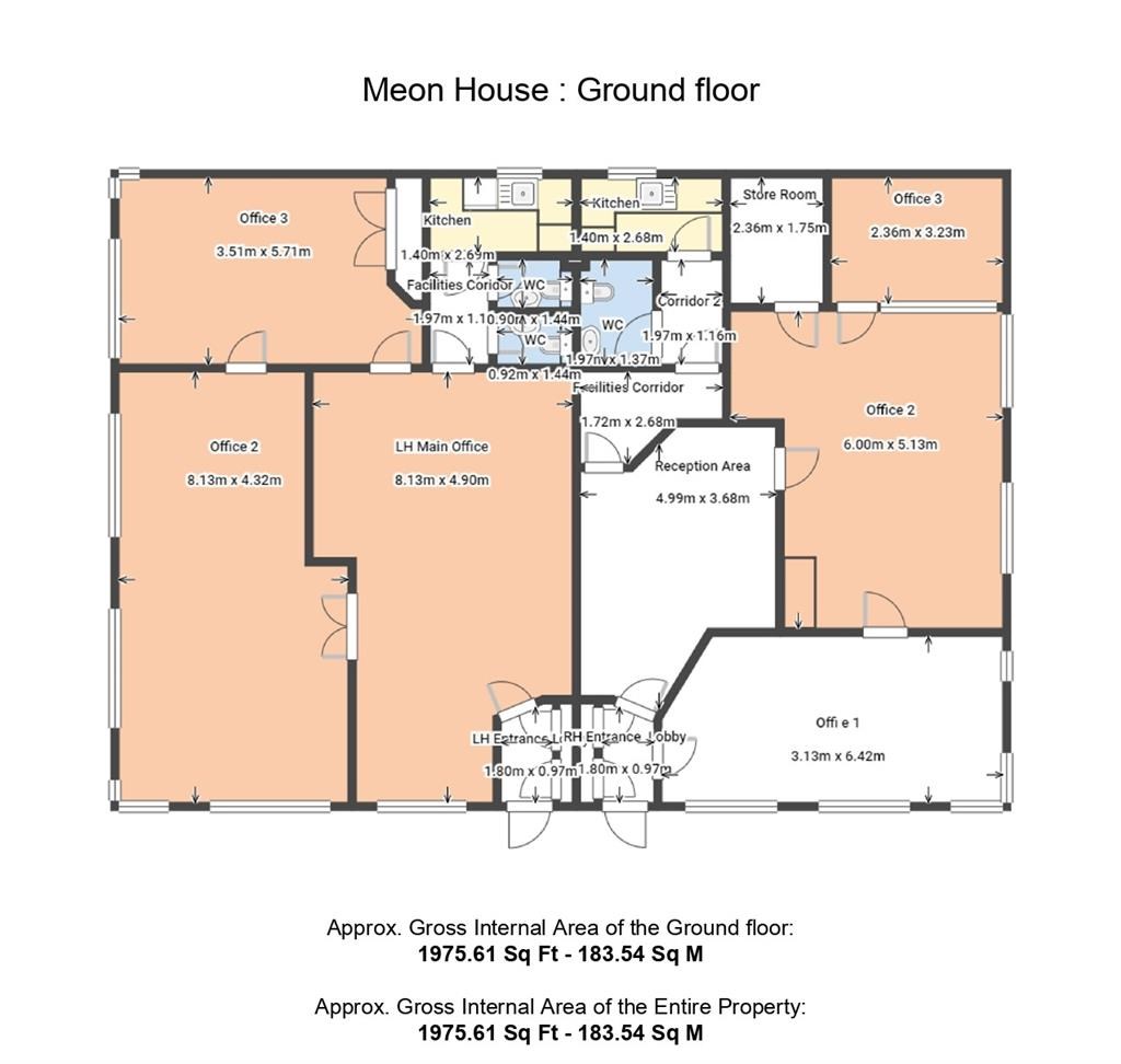 The property comprises ground floor office accommodation, which is currently split into two separate self-contained offices. The right hand side offers an entrance hallway, reception area, two offices, a meeting room, store room and WC. The left hand unit benefits from entrance hallway, reception/office, two further office rooms, two WC's and kitchen.